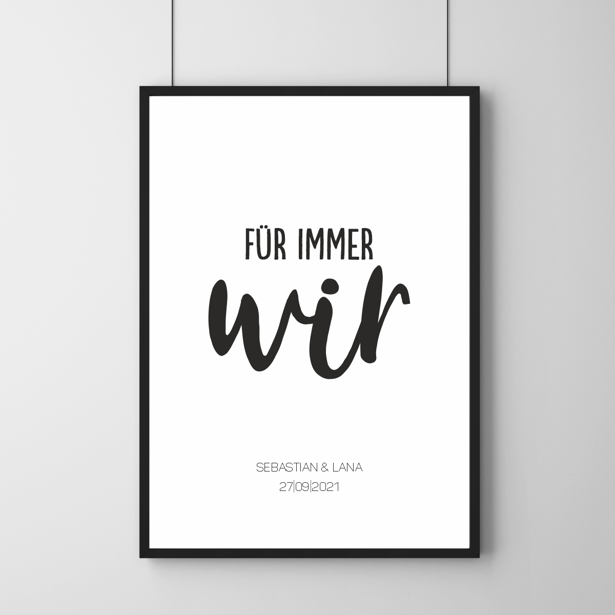 Poster - Für immer wir Diese schöne personalisierte Wand-Dekoration ist perfekt um das genaue Datum eures Hochzeitstages, den Tag des Beginns eurer Beziehung oder auch ein besonderes Ereignis festzuhalten. Füge die gewünschten Namen und das Datum einfach in das Textfeld ein, damit wir dein persönliches und individuelles Poster fertigen können. Festes, hochwertiges 250 g Papier (matt). Poster ohne Rahmen und Deko. Wähle aus den folgenden verschiedenen Größen (B x H): - 14,8 x 21 cm (DIN A5) - 20 x 25 cm - 21 x 29,7 cm (DIN A4) - 29,7 x 42 cm (DIN A3) - 30 x 40 cm - 42 x 59,4 cm (DIN A2) - 50 x 70 cm (DIN B2) - 59,4 x 84,1 cm (DIN A1) - 70 x 100 cm (DIN B1) **Aufgrund von Monitoreinstellungen sind geringe Farbabweichungen vom dargestellten Artikelbild möglich!**